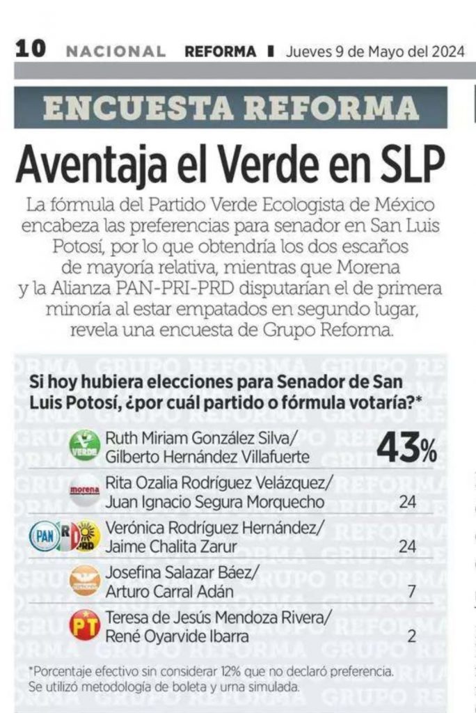 PVEM, puntero en encuesta de Grupo Reforma para el Senado