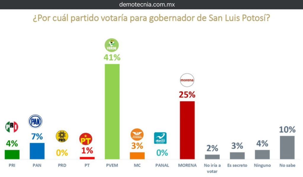 San Luis Potosí, SLP.- El Partido Verde Ecologista de México (PVEM) se consolida como la primera fuerza política en San Luis Potosí de cara a las próximas elecciones, de acuerdo con una reciente encuesta de la empresa De las Heras Demotecnia, una de las casas encuestadoras con mayor prestigio a nivel nacional. Según el […]
